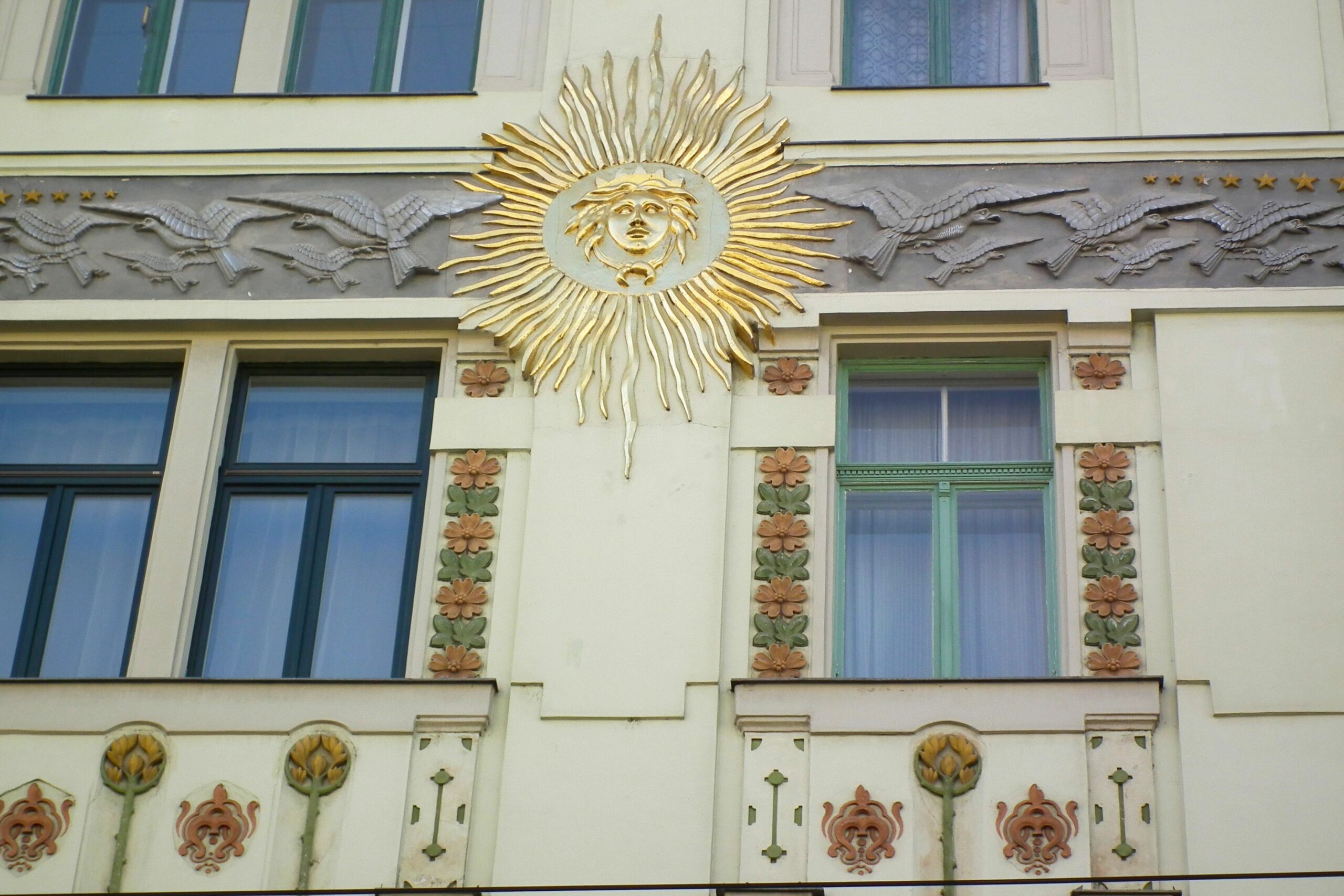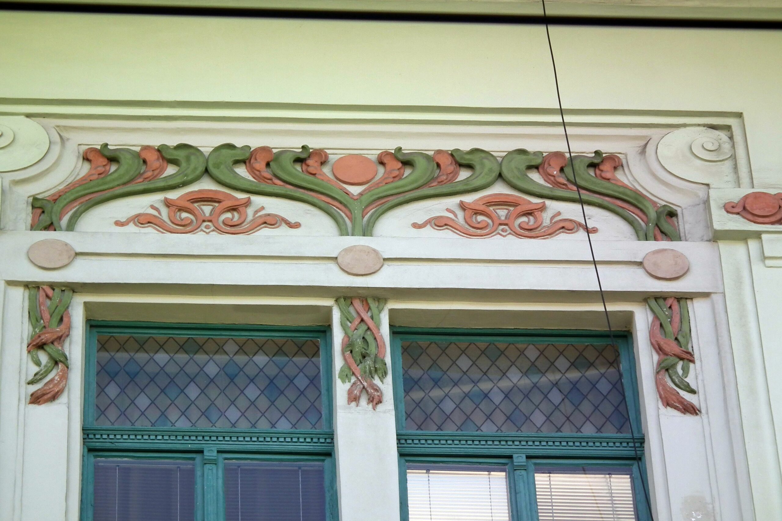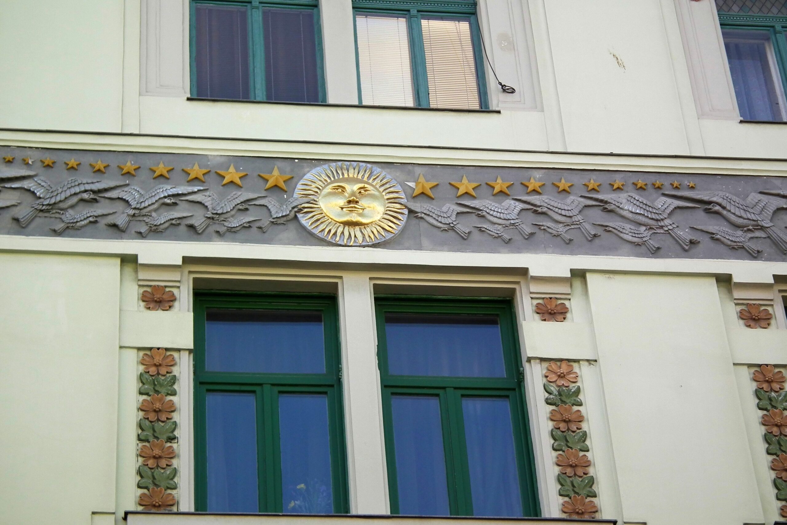 A 94. számú épületen a kék, zöld és a sárga színek, dominálnak. Az épületen szép számmal akadnak aranyozott díszek, melyek közt napkorongokat, csillagokat és pávákat találhatunk, mindezeket pedig számtalan állat- és növényábrázolás veszi körbe. Látványos a paradicsomi fa két almával és a csábító kígyóval ábrázoló díszek, de találkozhatunk itt kutyákkal, sőt, pávákkal is. A napkorongok felé szálló madarakat, a szép aranycsillagokat, a díszítősorok két szélén a Holdat jelképező ezüst nőalakokat is.