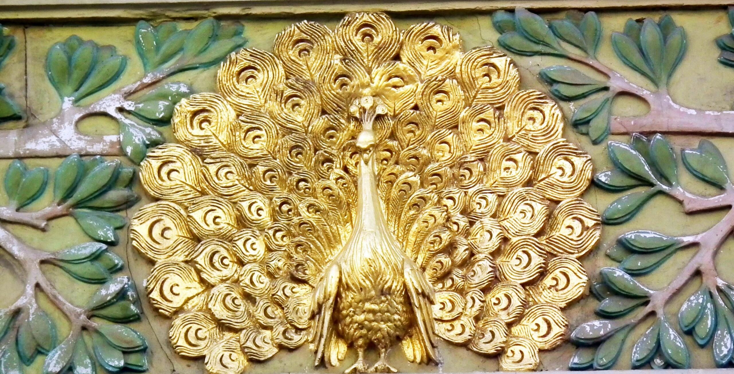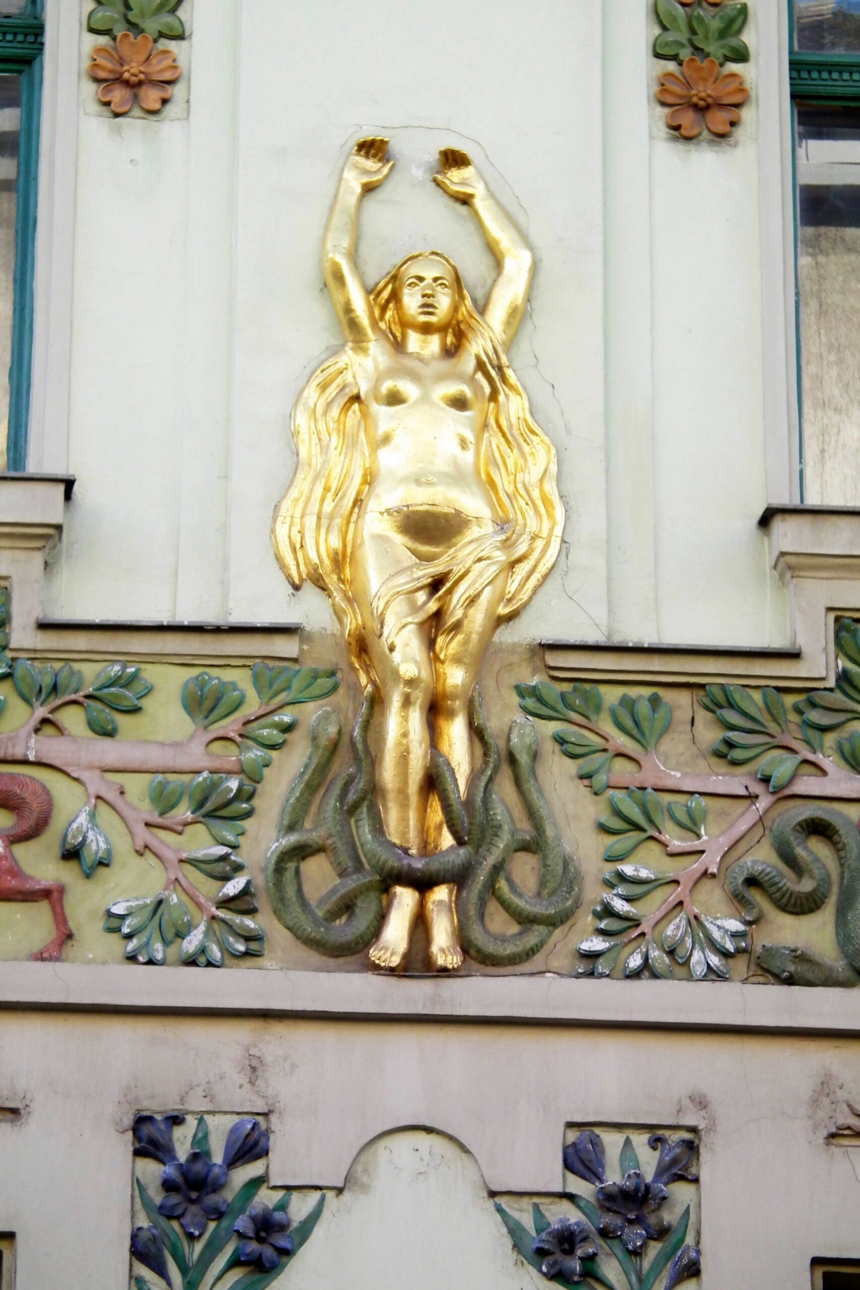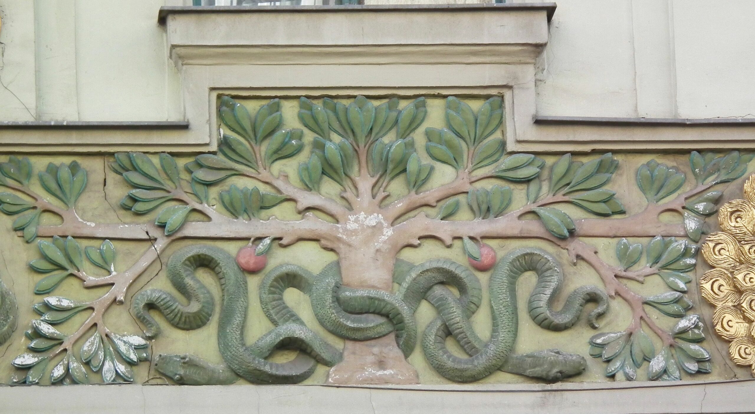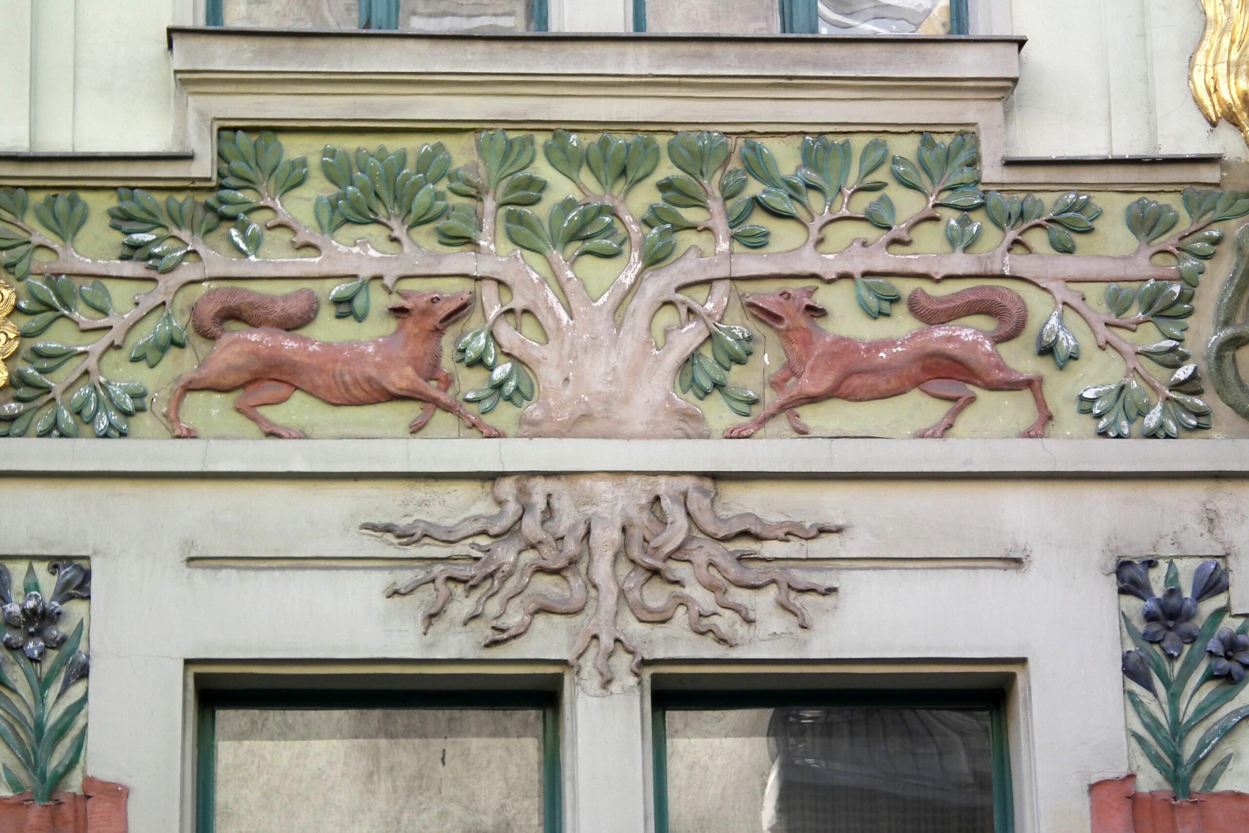 A 94. számú épületen a kék, zöld és a sárga színek, dominálnak. Az épületen szép számmal akadnak aranyozott díszek, melyek közt napkorongokat, csillagokat és pávákat találhatunk, mindezeket pedig számtalan állat- és növényábrázolás veszi körbe. Látványos a paradicsomi fa két almával és a csábító kígyóval ábrázoló díszek, de találkozhatunk itt kutyákkal, sőt, pávákkal is. A napkorongok felé szálló madarakat, a szép aranycsillagokat, a díszítősorok két szélén a Holdat jelképező ezüst nőalakokat is.